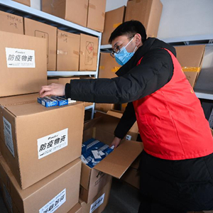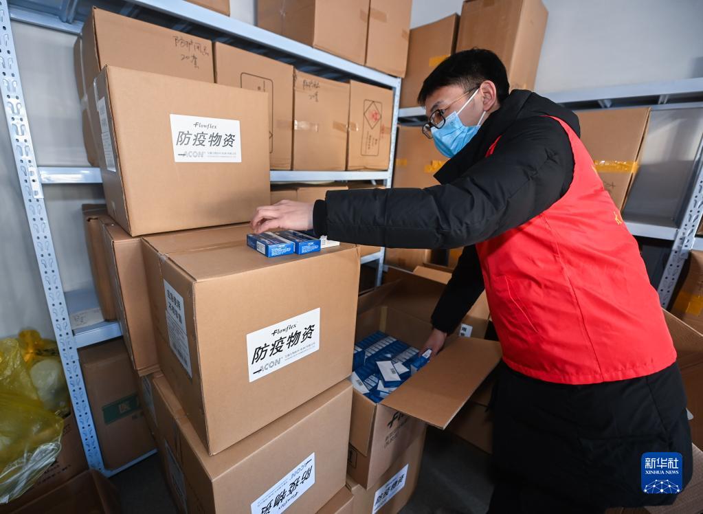 12月23日,在杭州市临安区太湖源镇党群服务中心,党员志愿者在拣选消毒液、口罩、必备药品等准备装入健康礼包。