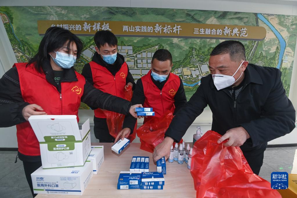 12月23日,在杭州市临安区太湖源镇党群服务中心,村社医疗小分队的志愿者们在分装健康礼包,健康礼包里有消毒液、口罩、必备药品等。