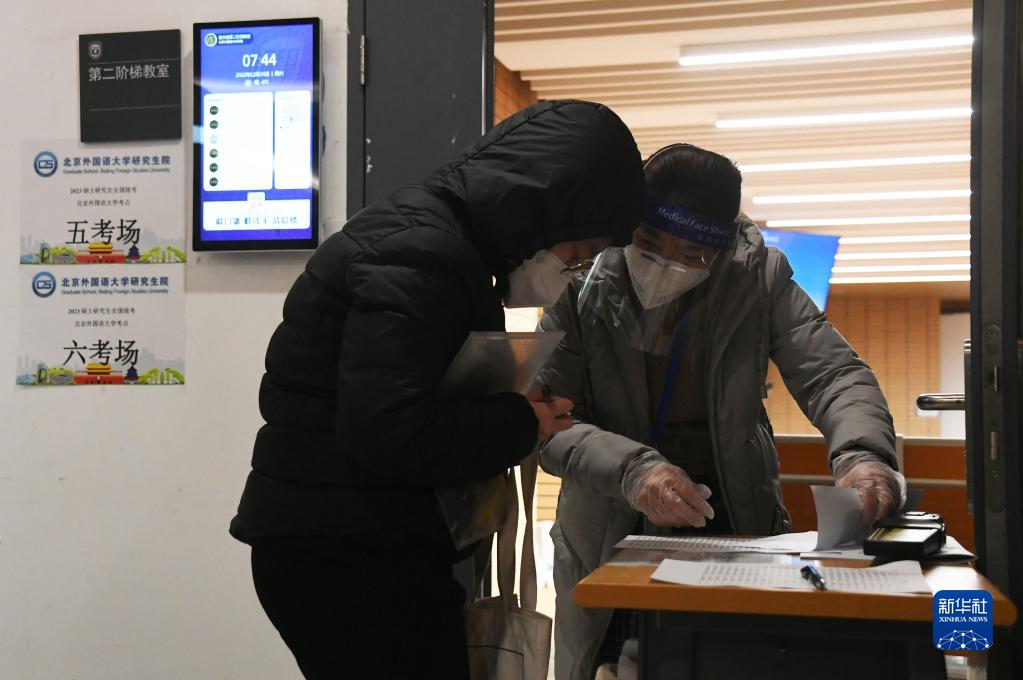 12月24日,在北京外国语大学考点,一名考生(左)在进入考场前签到。