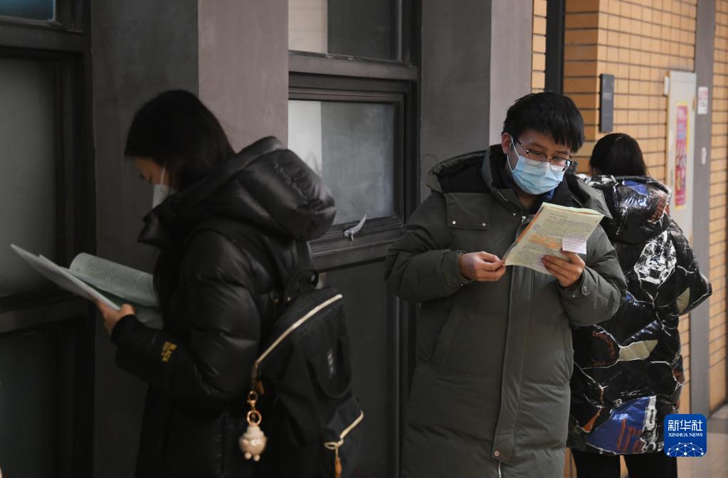 12月24日,在北京外国语大学考点,考生在进入考场前复习。