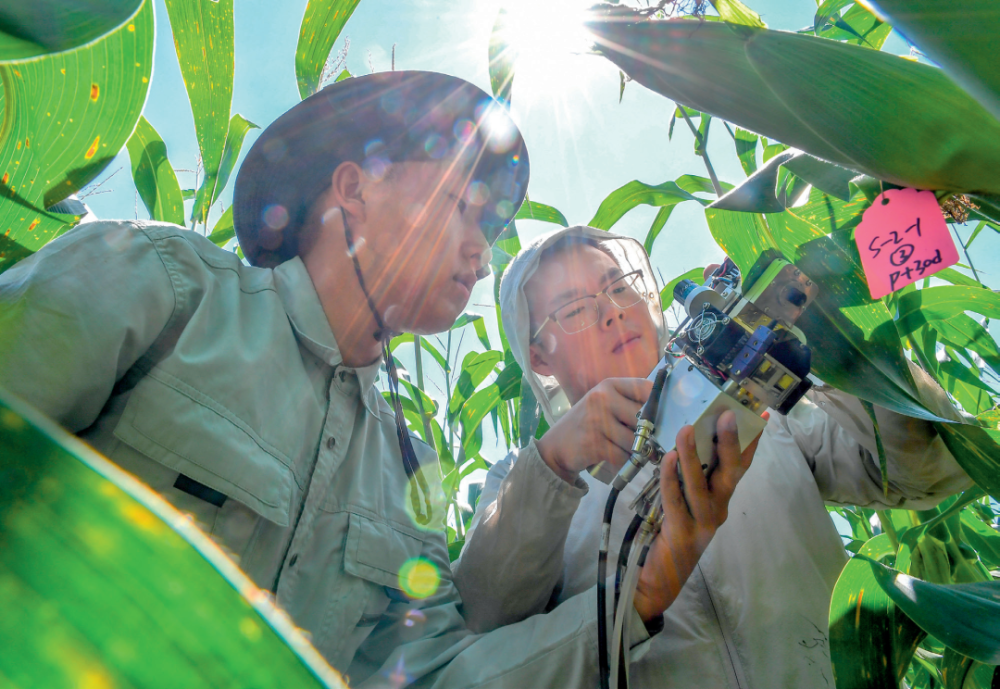 在吉林省梨树县,中国农业大学在读博士生沙野(右)和崔帅在试验田里测量玉米光合作用(2022年8月17日摄)。 张楠摄