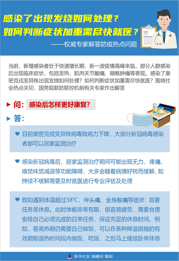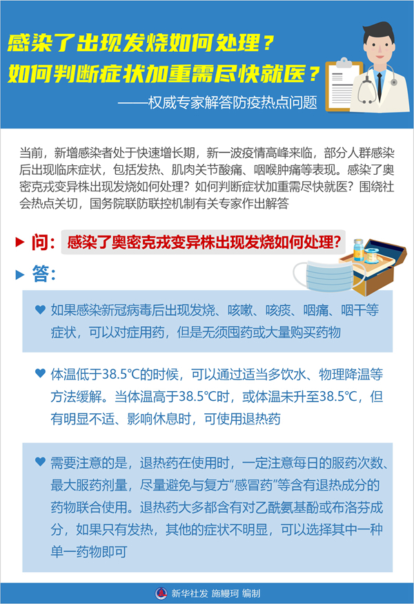 当前,新增感染者处于快速增长期,新一波疫情高峰来临,部分人群感染后出现临床症状,包括发热、肌肉关节酸痛、咽喉肿痛等表现。感染了奥密克戎变异株出现发烧如何处理?如何判断症状加重需尽快就医?围绕社会热点关切,国务院联防联控机制有关专家作出解答。