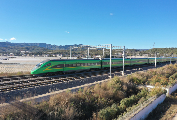 一辆“复兴号”列车行驶在中老铁路昆明市晋宁区内(2022年12月2日摄,无人机照片)。新华社发(梁志强 摄)