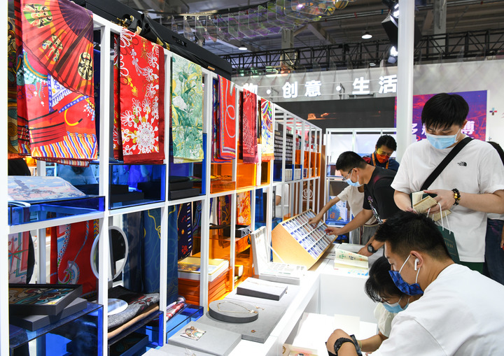 9月4日,观众在服贸会首钢园区的文旅服务专题展区挑选商品。新华社记者 韩旭 摄
