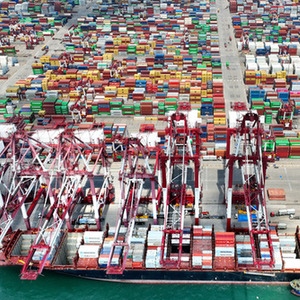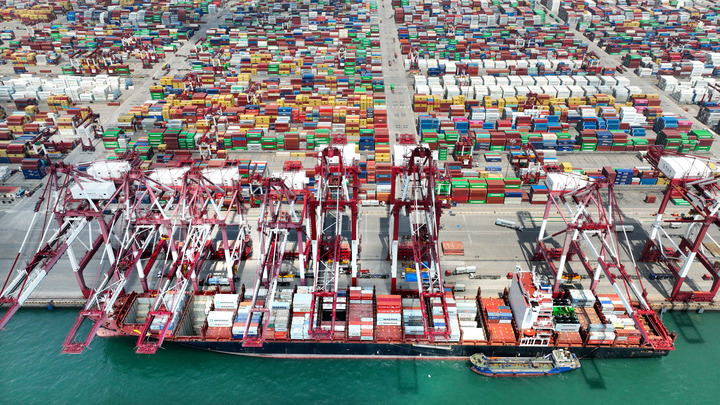 集装箱货轮在山东港口青岛港前湾集装箱码头装卸。(新华社记者李紫恒 摄)