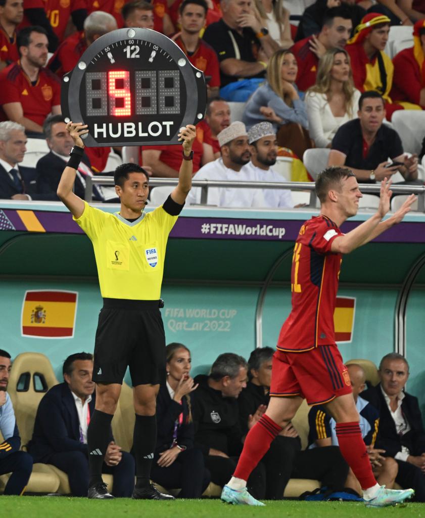 11月23日,在2022卡塔尔世界杯足球赛E组西班牙队对阵哥斯达黎加队的比赛中,马宁(左)担任第四官员。新华社记者李尕摄