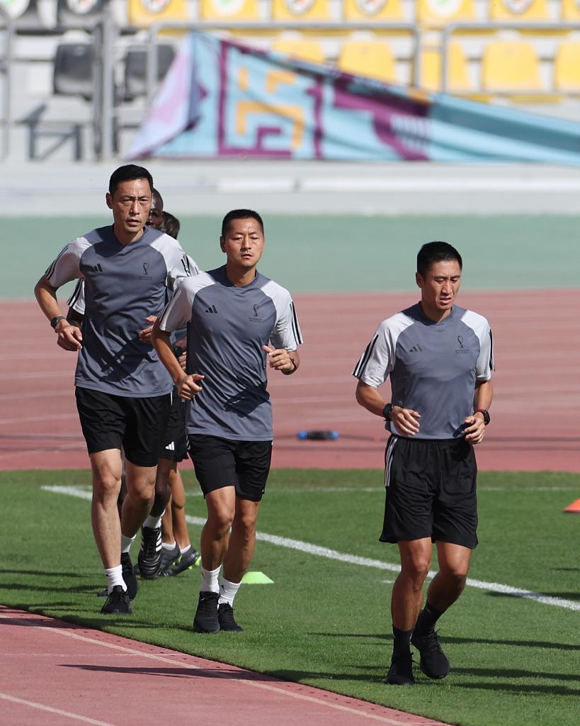 11月18日,入选2022年卡塔尔世界杯裁判员名单的马宁、曹奕与施翔(从右至左)在卡塔尔体育俱乐部球场进行训练。新华社记者贾浩成摄