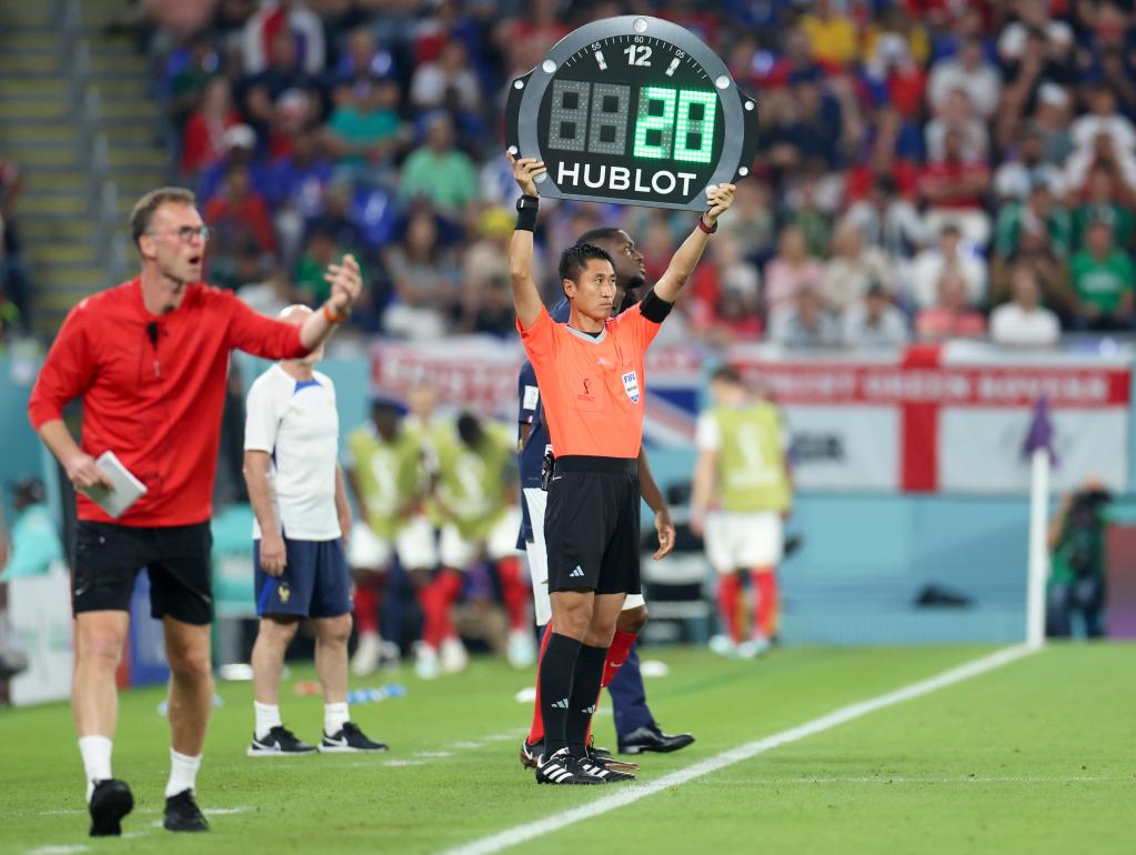 11月26日,在2022卡塔尔世界杯足球赛D组法国队对阵丹麦队的比赛中,马宁(右)担任第四官员。新华社记者李明摄