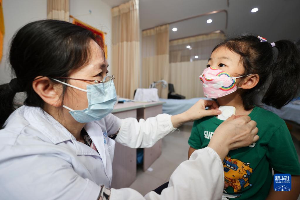 2022年7月16日,入伏首日,江苏省连云港市赣榆区中医院的医务人员为孩子贴“三伏贴”。