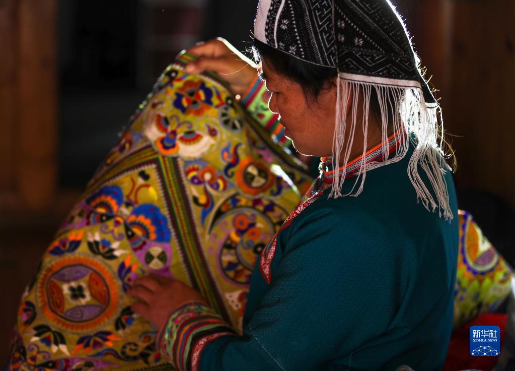 2022年5月2日,村民在贵州省榕江县塔石乡乌吉苗寨检查苗族绣品。乌吉苗寨是黔东南州苗族蜡染刺绣非物质文化遗产生产性保护示范基地。近年来,当地积极挖掘苗族刺绣、蜡染等“非遗”技艺,带动村民从事苗族传统刺绣、蜡染等手工制品生产与外销,实现“非遗”传承与市场对接,走出一条传统“非遗”助力乡村振兴的新路子。