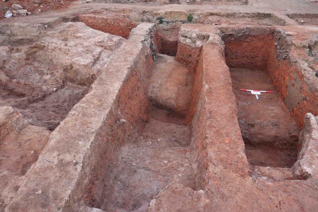 考古人员发现,祭祀坑1的底部是一个红烧土坑,形状呈圆角长方形,宽7.5米到11米,向北延伸到发掘区外。祭祀坑1和红烧土坑的西侧外围还发现一处石头遗迹,由大小不等的石子铺垫组成,整体呈半环形环绕着祭祀坑,宽约10米,经判断可能是通往墓葬祭祀区的道路。