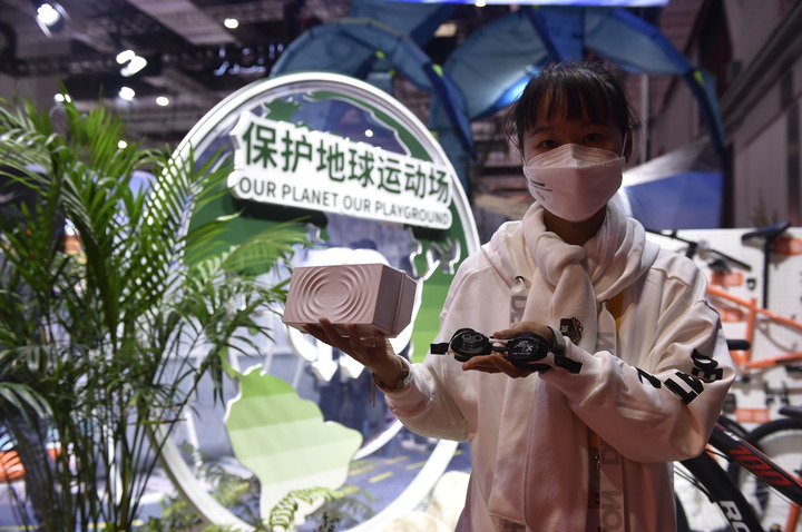 11月7日,在第五届进博会消费品展区,一家参展商的工作人员展示以甘蔗渣为原料制作的泳镜盒。新华社记者 鲁鹏 摄