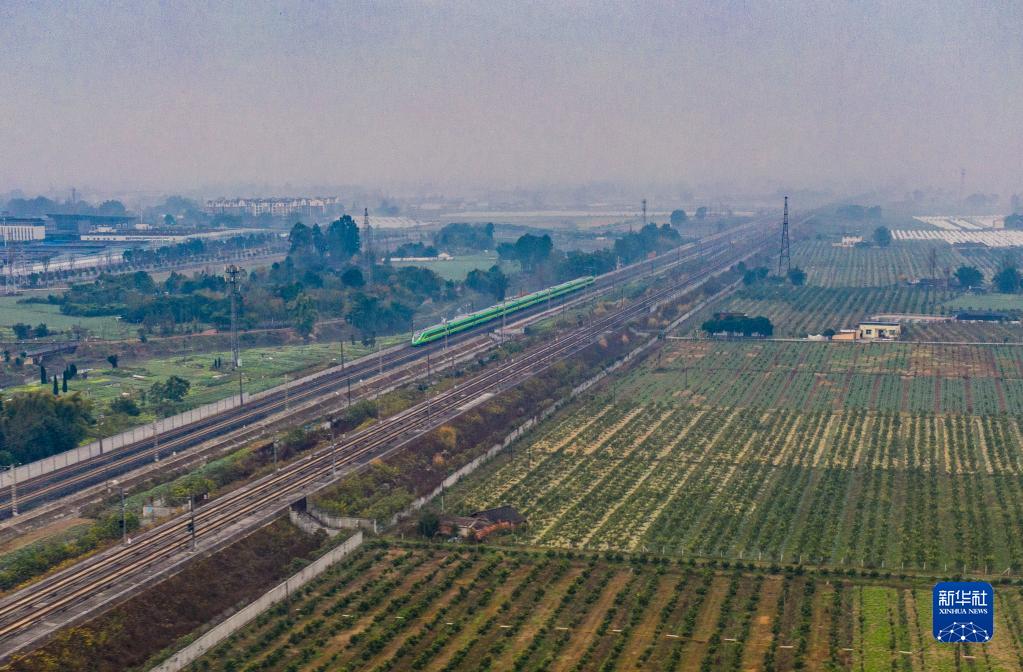 12月26日,新成昆铁路首发列车行驶在四川省眉山市彭山区(无人机照片)。