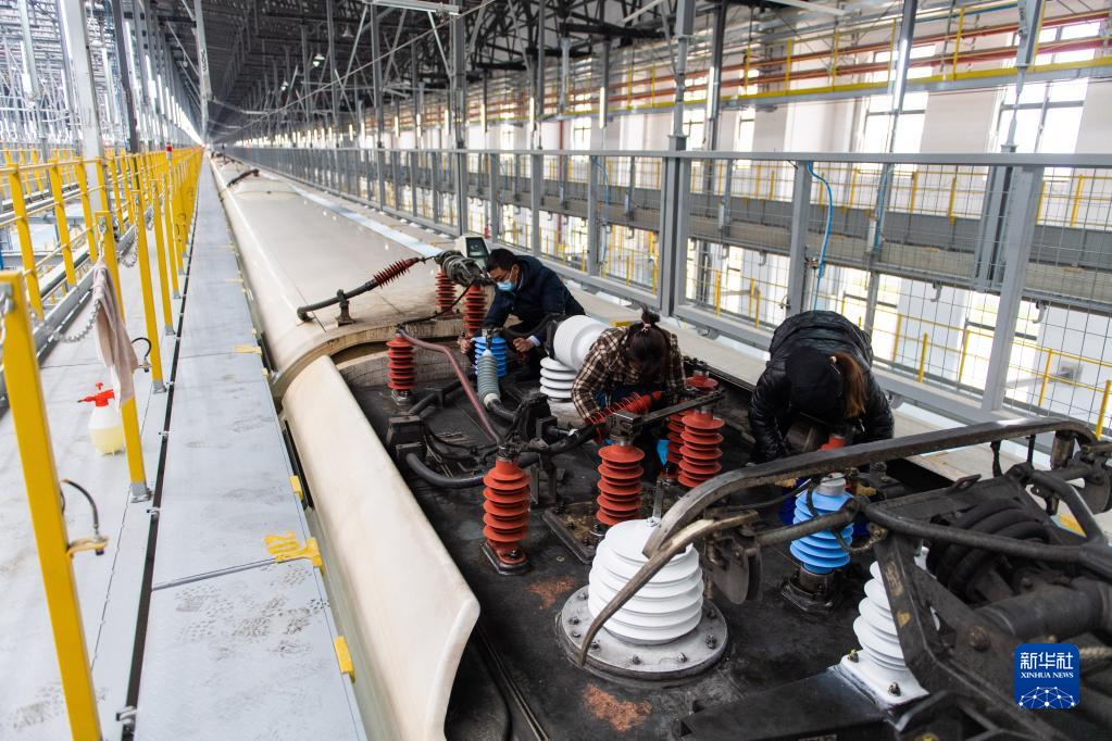 12月26日,工作人员在渝厦高铁长沙西动车运用所6线检查库对停放的列车进行保养。