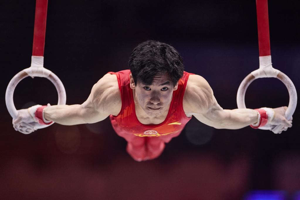 张博恒在吊环比赛中(新华社记者孟鼎博摄)