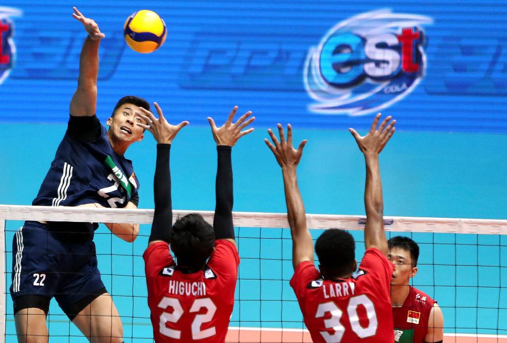 张景胤(左一)在比赛中扣球(新华社记者王腾摄)