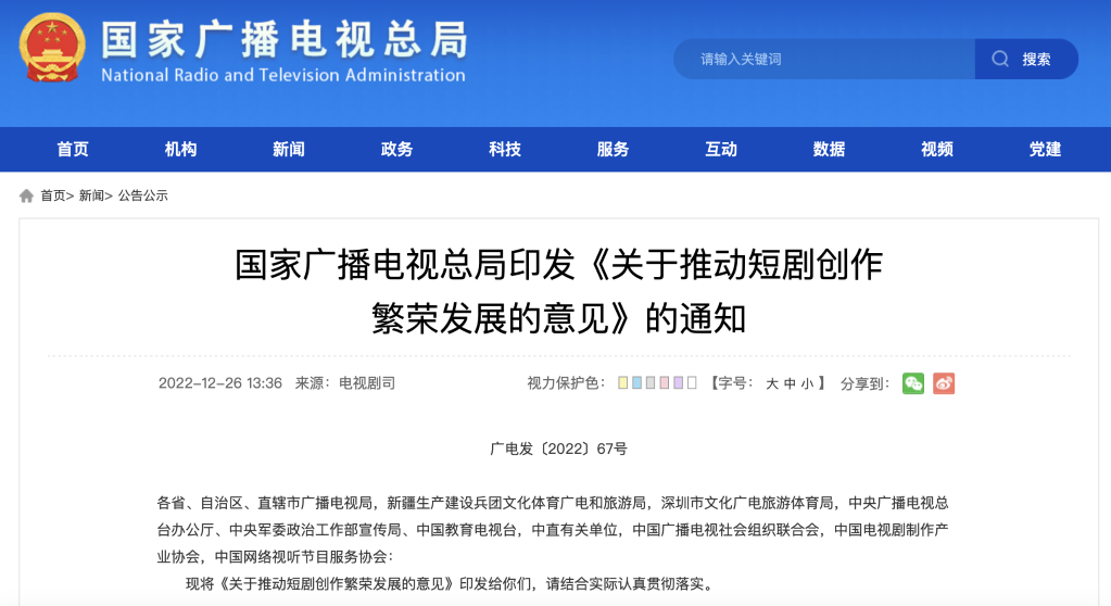 记者12月26日从国家广播电视总局获悉,《关于推动短剧创作繁荣发展的意见》于日前印发。意见提出,要提升短剧创新创造能力,统筹发挥短剧和中长剧集等不同类型剧集优势特长,根据题材特点和内容含量合理安排篇幅,既倡导史诗气象的鸿篇巨制,也鼓励删繁就简的精炼短剧,推动电视荧屏、视频网站、移动客户端等剧集供给结构科学合理、内容丰富精彩。