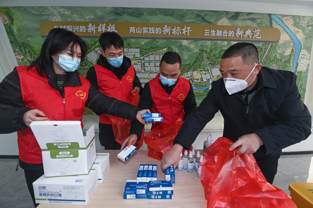 在杭州市临安区太湖源镇党群服务中心,村社医疗小分队的志愿者们在分装健康礼包,健康礼包里有消毒液、口罩、必备药品等。新华社记者徐昱 摄