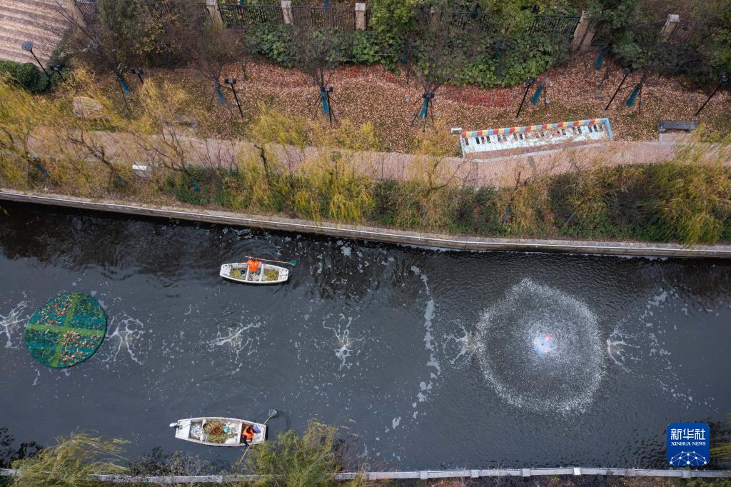 12月28日,龙泉街道的保洁人员在市陌河上清理漂浮物(无人机照片)。