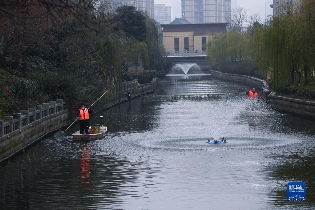 12月28日,龙泉街道的保洁人员在市陌河上清理漂浮物。