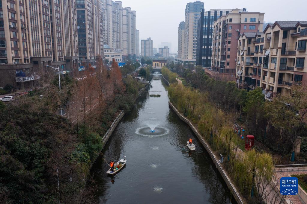 12月28日,龙泉街道的保洁人员在市陌河上清理漂浮物(无人机照片)。