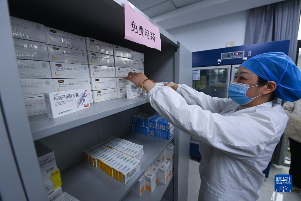 12月28日,在织里镇轧村村卫生室的药房内,医生在整理一批用于免费赠药给村民的解热镇痛药物。