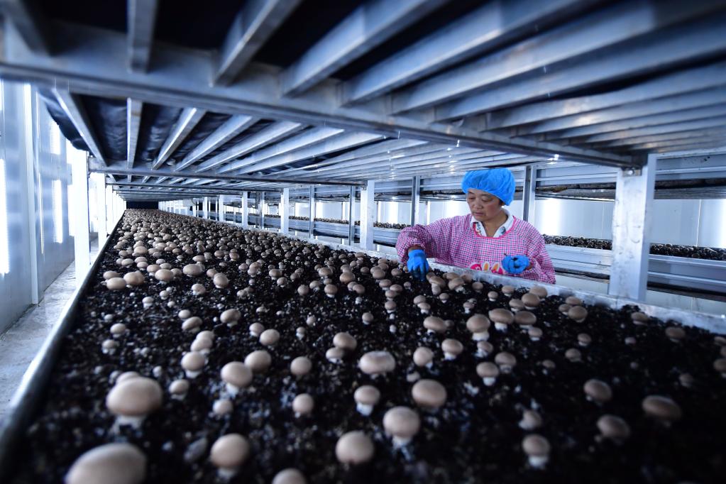 在河南兰考县东坝头乡张庄村,一名村民在一食用菌企业的车间内采摘褐蘑菇。新华社记者 冯大鹏 摄