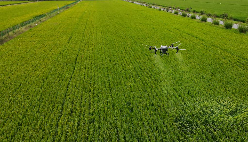 9月21日,在上海嘉定区外冈镇的数字化无人农场,一架植保无人机喷洒农药。新华社记者 方喆 摄