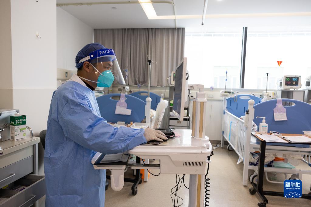 12月27日,在上海交通大学医学院附属新华医院儿童急诊ICU阳性病区,医生在输入病例信息。