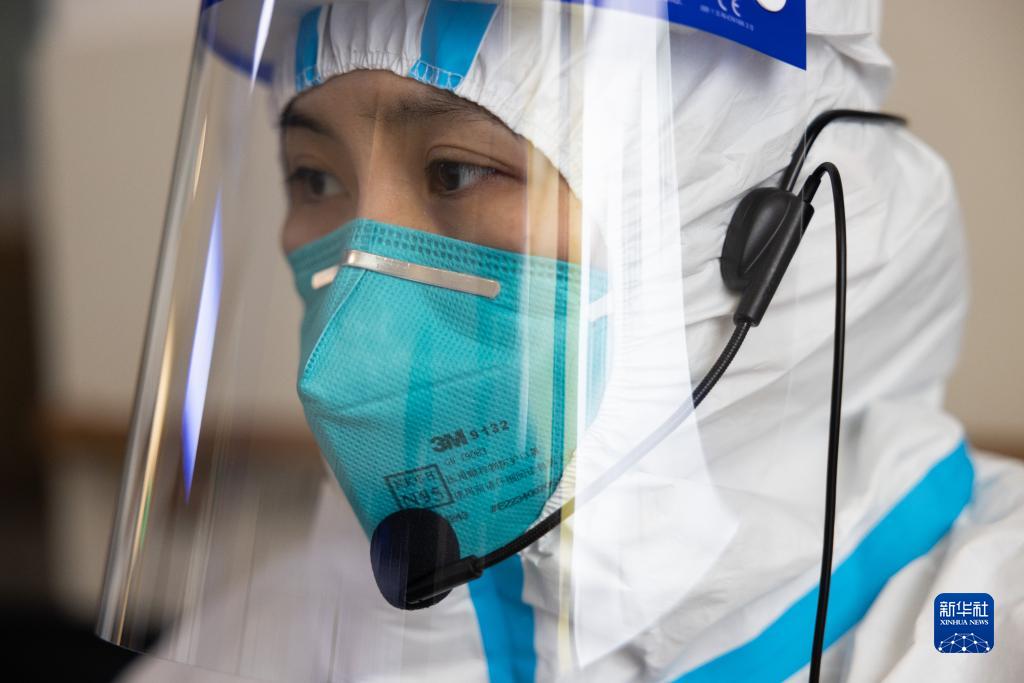 12月27日,在上海交通大学医学院附属新华医院儿科发热门诊预检台前,头戴话筒的护士在回答家长提问。