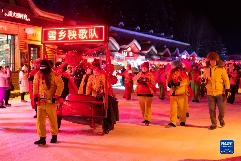 12月14日,秧歌队在雪乡景区内表演。新华社记者 谢剑飞 摄