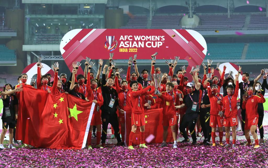 2月6日,中国队在颁奖仪式上庆祝。新华社发(贾韦德·达尔摄)