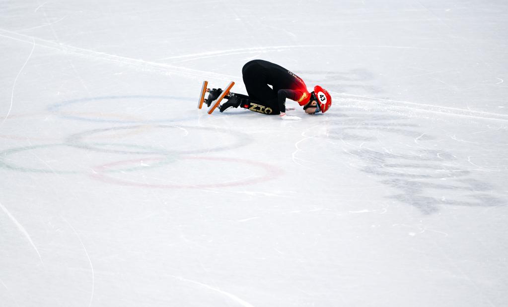 2月13日,中国队选手范可新在比赛后亲吻冰面。新华社记者李一博摄