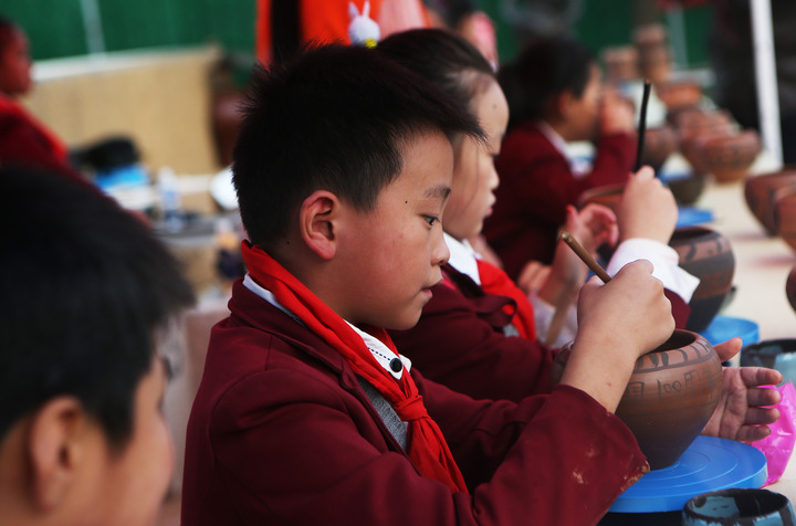 2021年10月,小朋友在仰韶村国家考古遗址公园内的考古体验园绘制纹饰。(新华社记者 许雅楠 摄)