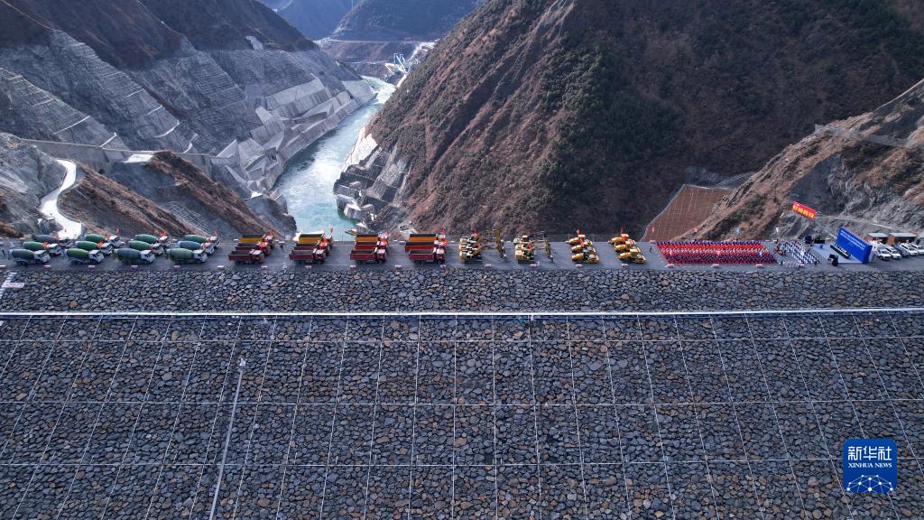 12月29日,雅砻江两河口混合式抽水蓄能电站开工仪式在四川雅江两河口水电站大坝上举行(无人机照片)。