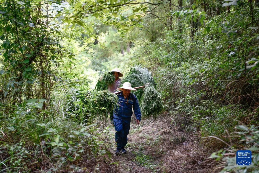 刘开福(前)与村民搬运投喂蚂蚱所需的草料(2022年8月3日摄)。