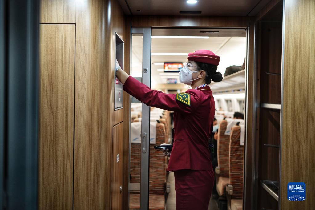 12月30日,由唐山开往北京的G8802次列车乘务员在列车上工作。新华社发(赵亮 摄)
