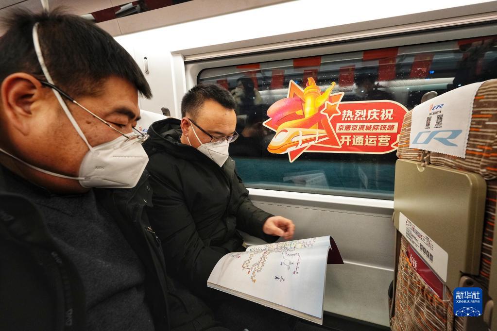 12月30日,唐山开往北京的首趟G8802次列车上的旅客。新华社发(赵亮 摄)