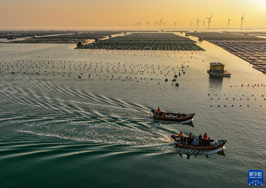 12月31日,在山东省荣成市石岛管理区桑沟湾海洋牧场,渔民们驾驶渔船前往网箱养殖区进行作业(无人机照片)。