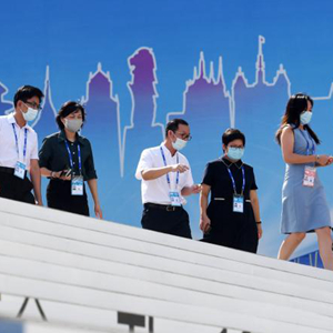2022年9月16日,观众走出南宁国际会展中心。当日,第十九届中国-东盟博览会和中国-东盟商务与投资峰会在广西南宁国际会展中心开幕,主题为“共享RCEP新机遇,助推中国-东盟自由贸易区3.0版”。新华社记者 陆波岸 摄