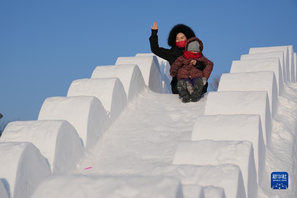 12月31日,游客在第35届哈尔滨太阳岛国际雪雕艺术博览会园区内玩滑梯。