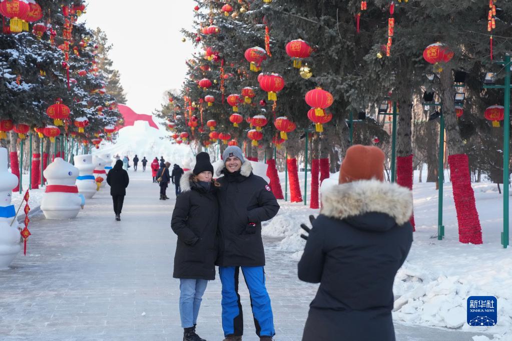 12月31日,游客在第35届哈尔滨太阳岛国际雪雕艺术博览会园区内拍照留念。