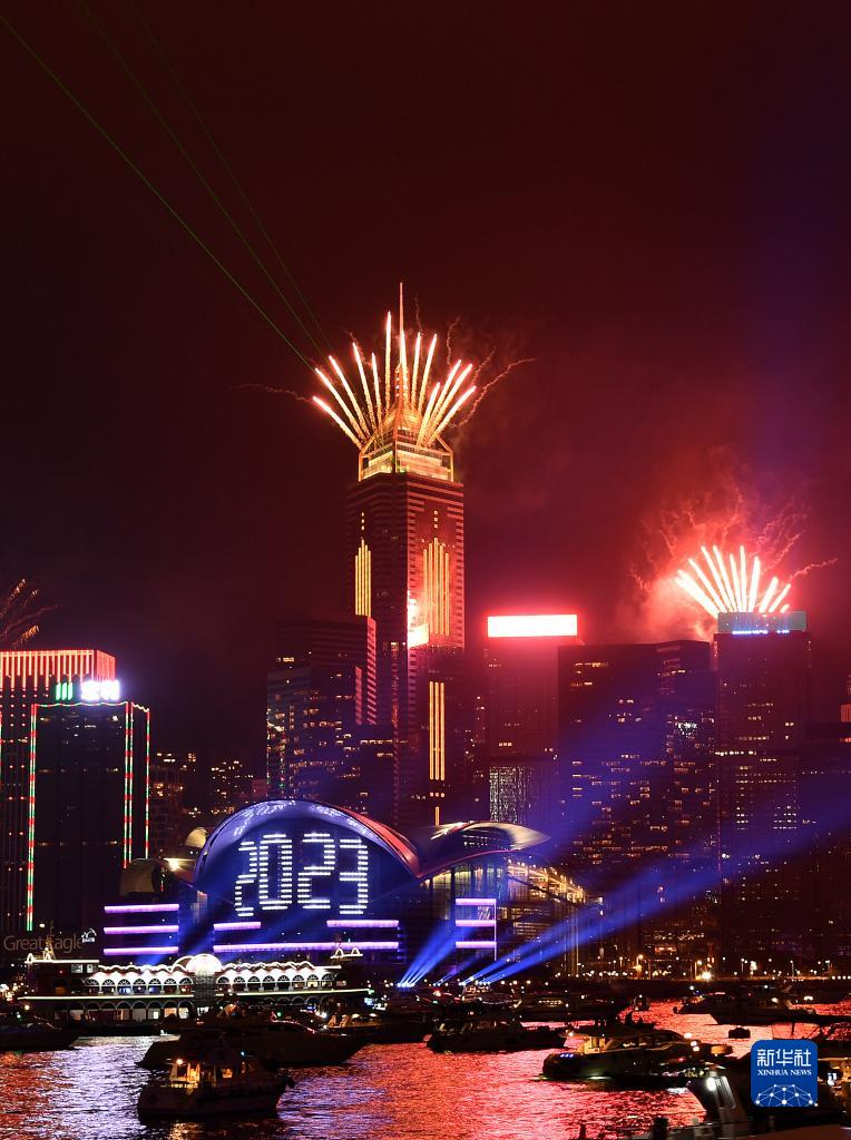 1月1日,香港维多利亚港上演“幻彩咏香江”加强版烟火光影汇演,迎接2023年的到来。新华社记者 陈铎 摄