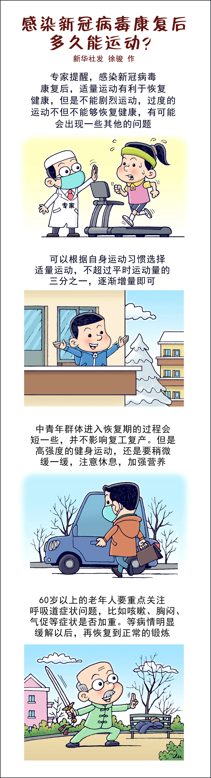 “对于60岁以上的老年人来说,尤其是患有糖尿病、高血压、冠心病等慢性病的人群,要重点关注呼吸道症状问题,比如咳嗽、胸闷、气促等症状是否加重。”高燕介绍,一周左右核酸或者抗原转阴后,这些呼吸道症状可能还会持续,等病情明显缓解以后,再恢复到正常的锻炼,更有利于健康。