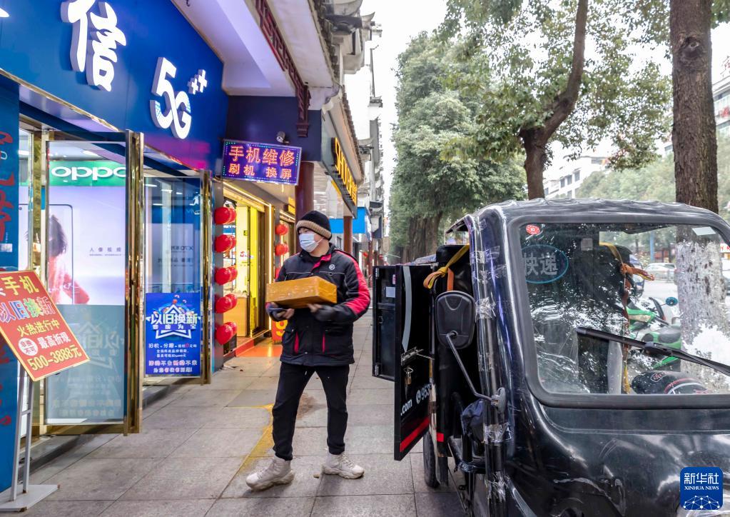 1月1日,快递员在贵州省黔西市水西大道送快递。