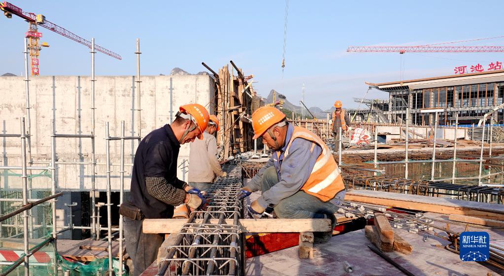 1月1日,工人在贵南高铁广西河池站前广场工地捆扎钢筋。