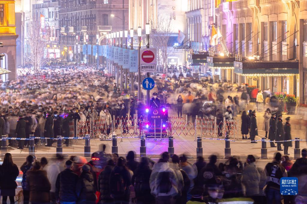 1月1日凌晨,武警上海总队机动第一支队官兵在南京东路路口以“环岛”形式疏导人流。
