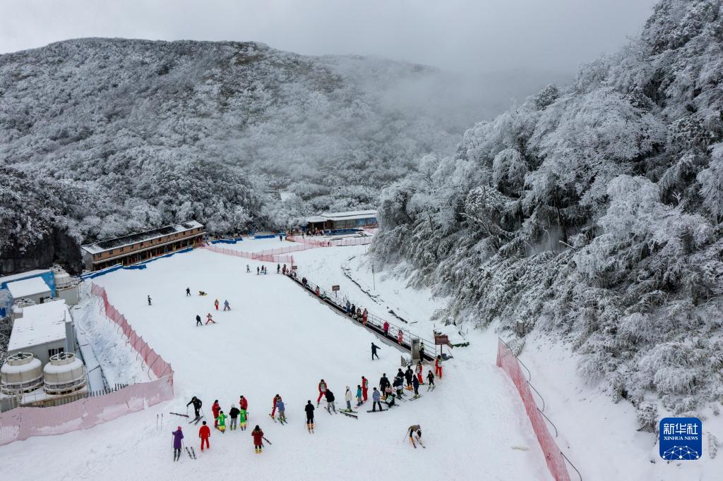 1月1日,游客在金佛山景区的滑雪场体验滑雪(无人机照片)。