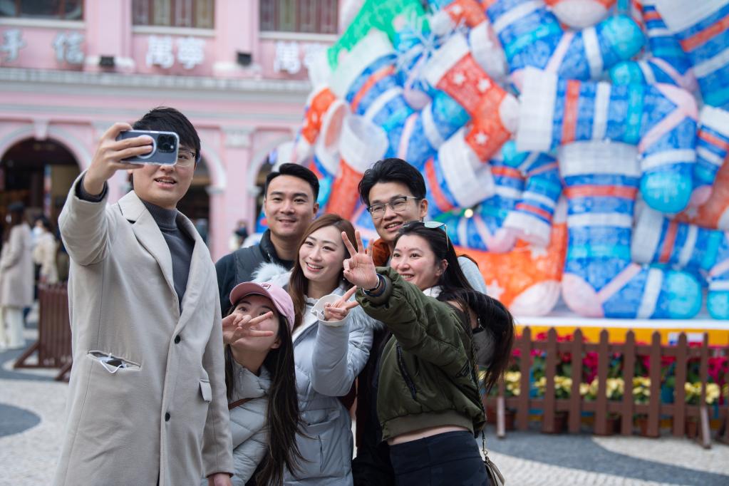 1月1日,旅客在澳门议事亭前地自拍。新华社记者 张金加 摄