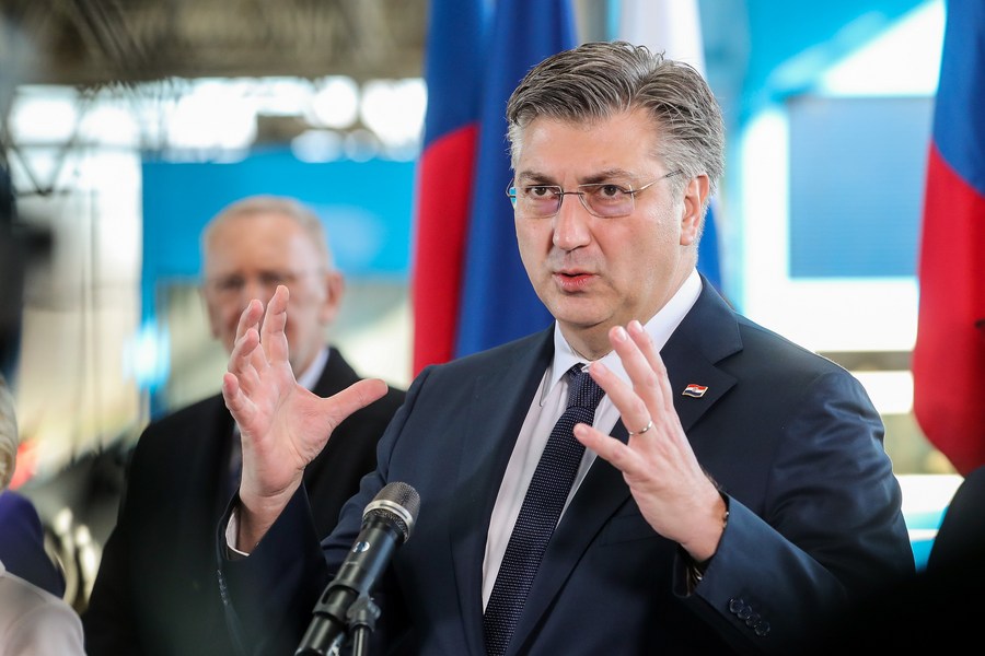 1月1日,在克罗地亚与斯洛文尼亚边境的布雷加纳,克罗地亚总理普连科维奇出席记者会。新华社发(Pixsell图片社/卢卡·施坦茨尔 摄)